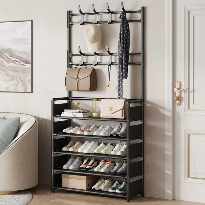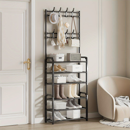 Todo en uno: Zapatero, perchero y estante en un solo lugar.